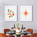 Description: Add a burst of color to your walls with this fabulous mid century modern art set. The first design features two shades of orange, turquoise, cream, and black geometric squares and the second design features a coordinating orange atomic starburst.